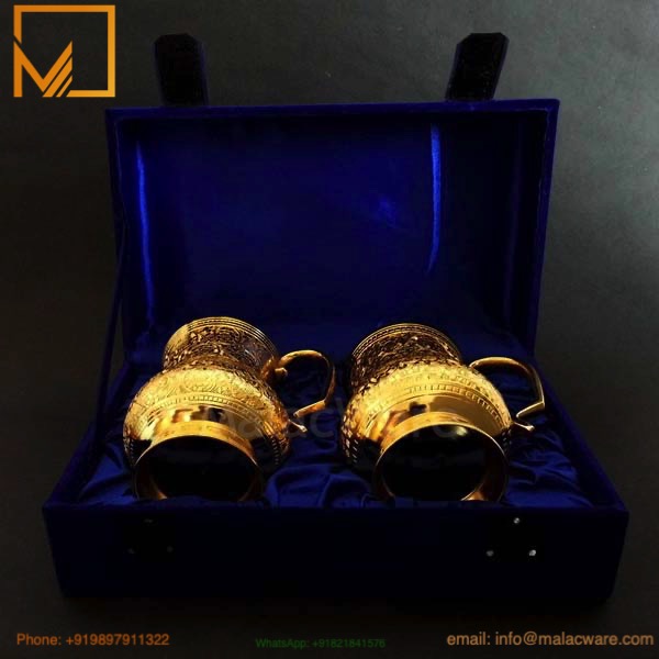 Made from high-quality solid brass and finished in radiant gold, these 12 cm x 7.6 cm mugs feature intricate carvings and a sturdy handle for a luxurious yet practical feel. The warm golden tone and detailed engraving make them ideal for home use, boutique hotels, fine dining establishments, or as a refined corporate gift set.