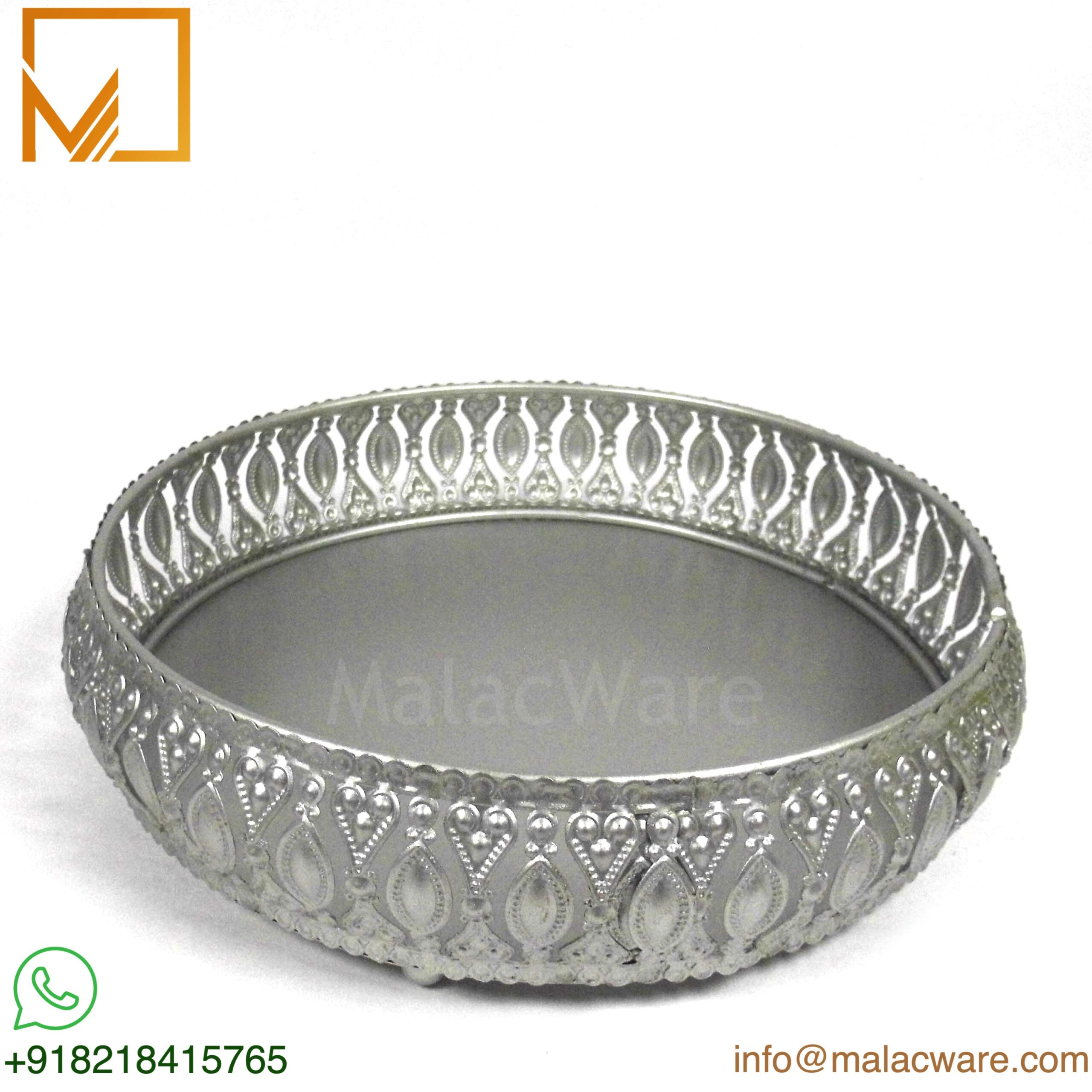 Crafted from durable metal with a fine silver-toned finish, it is ideal for serving coffee, tea, or sweets, and equally suited as a decorative platter or centerpiece. Its intricate craftsmanship and elegant shine make it a popular choice for weddings, Diwali, Eid, and housewarming events.